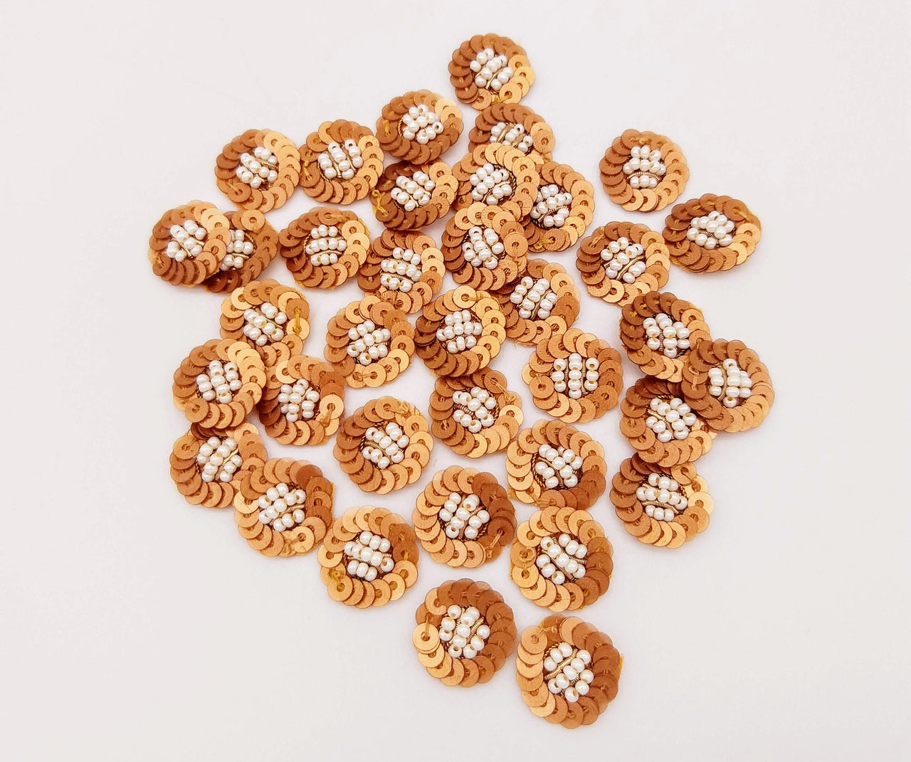 KnicKnackNook proudly presents a lovely 10 Bronze Sequins and Pearls Tiny Round Appliques, Beaded Applique, Headband Applique, Seed Beads Appliques. This can be used for quilting, dress design, pillow covers, bag, Headband, Jewellery, the potential is just endless.