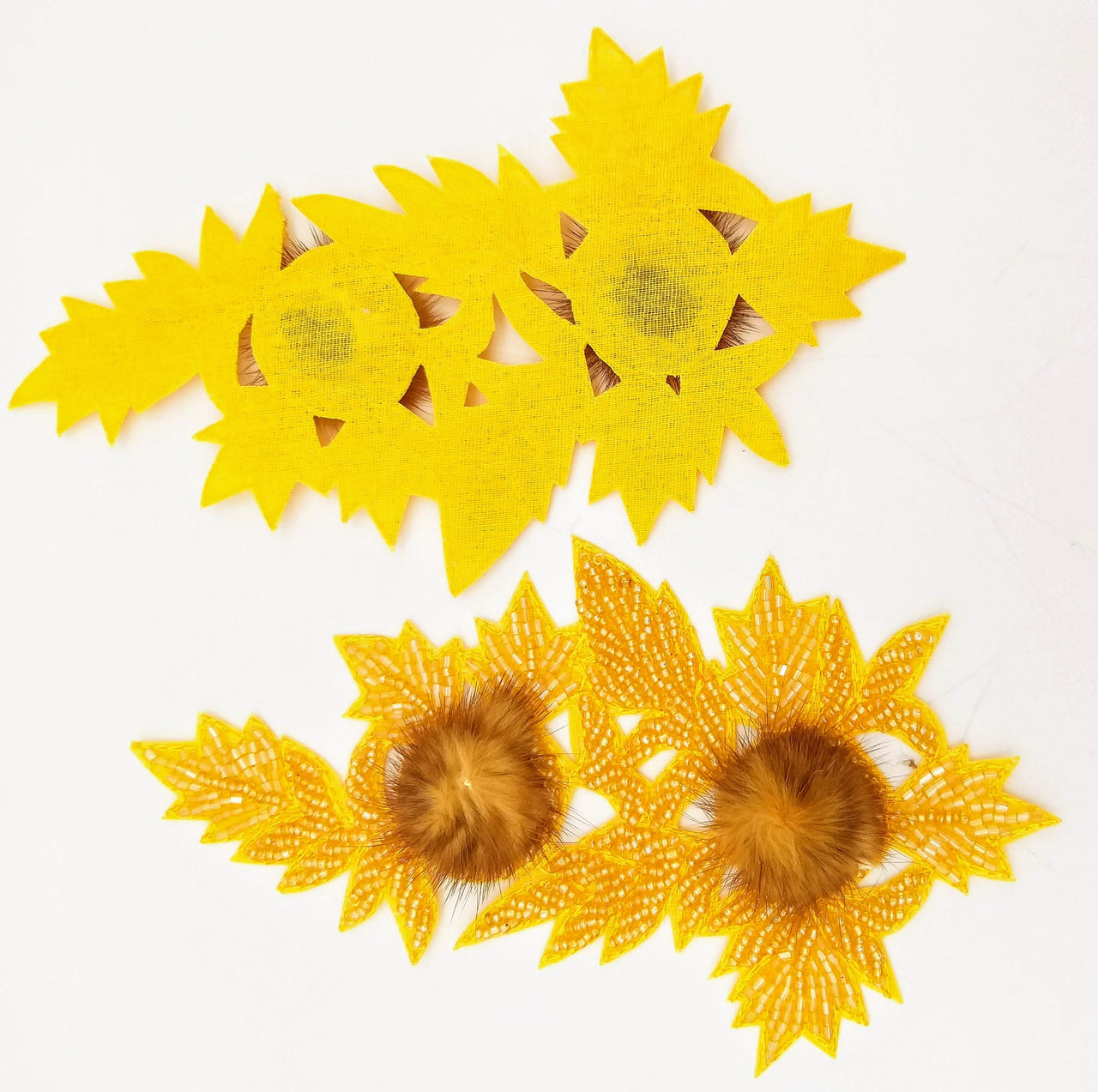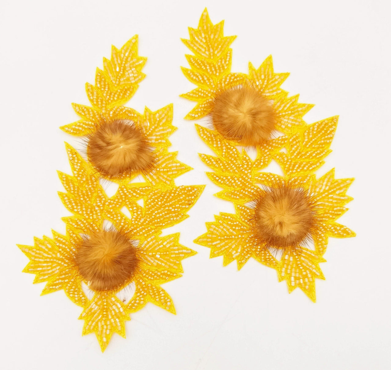 KnicKnackNook proudly presents a lovely Yellow Hand Embroidered Floral Applique, Beaded Floral Motif With Feather Pom Pom, 1 Pc.