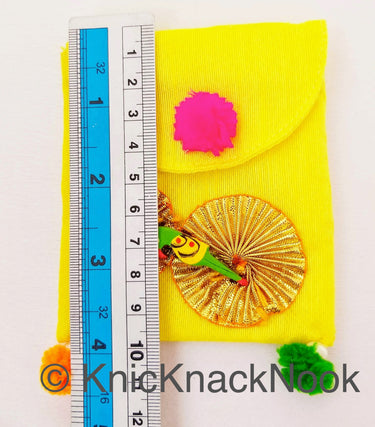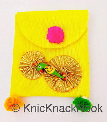 Yellow Gift Envelope Pouch Embellished PomPoms Gold Ribbon Wood Parrot Designer Unique Gift Money Envelope Wedding Gift.