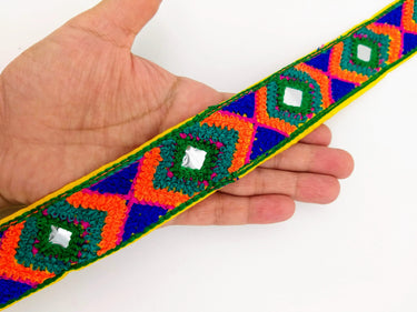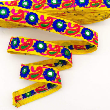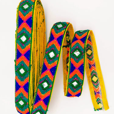 This listing is for a lovely Yellow Cotton Fabric Embroidered Mirrored Trim In Green, Orange & Blue, Bohemian Trim, Decorative Border, Sari Trim.