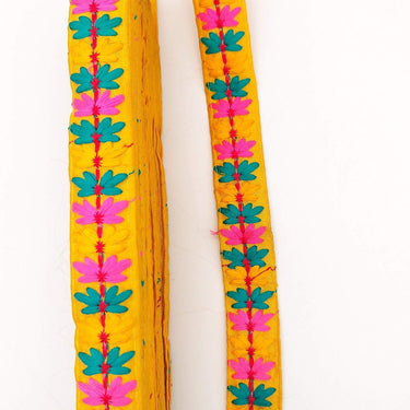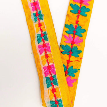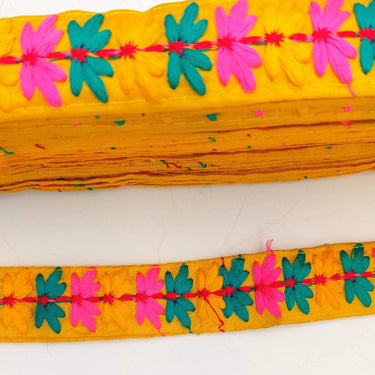 This listing is for a lovely Yellow Cotton Fabric Trim with Floral Embroidery in Blue, Pink, Yellow and Red, Parsi Embroidery, Approx. 27mm Wide, Trim By 2 Yards.