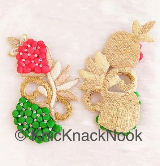 Green, Red, Beige And Gold Embroidered Flower Applique Patch With Diamante Crytals