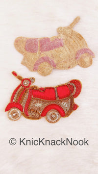 Hand Embroidered Motor Scooter Applique In Red, Gold And Silver Zardozi Threadwork, Motorcycle Motif