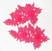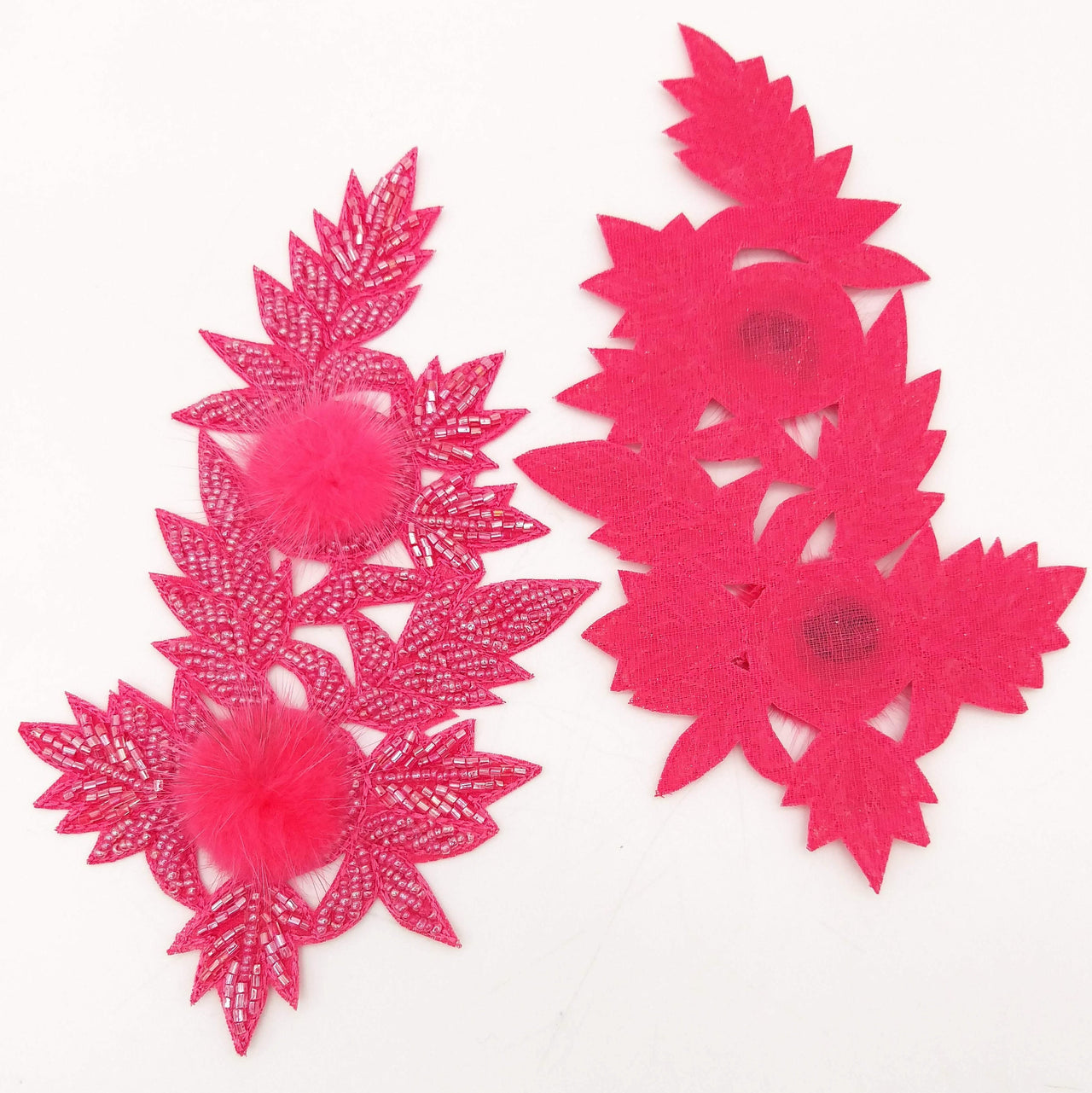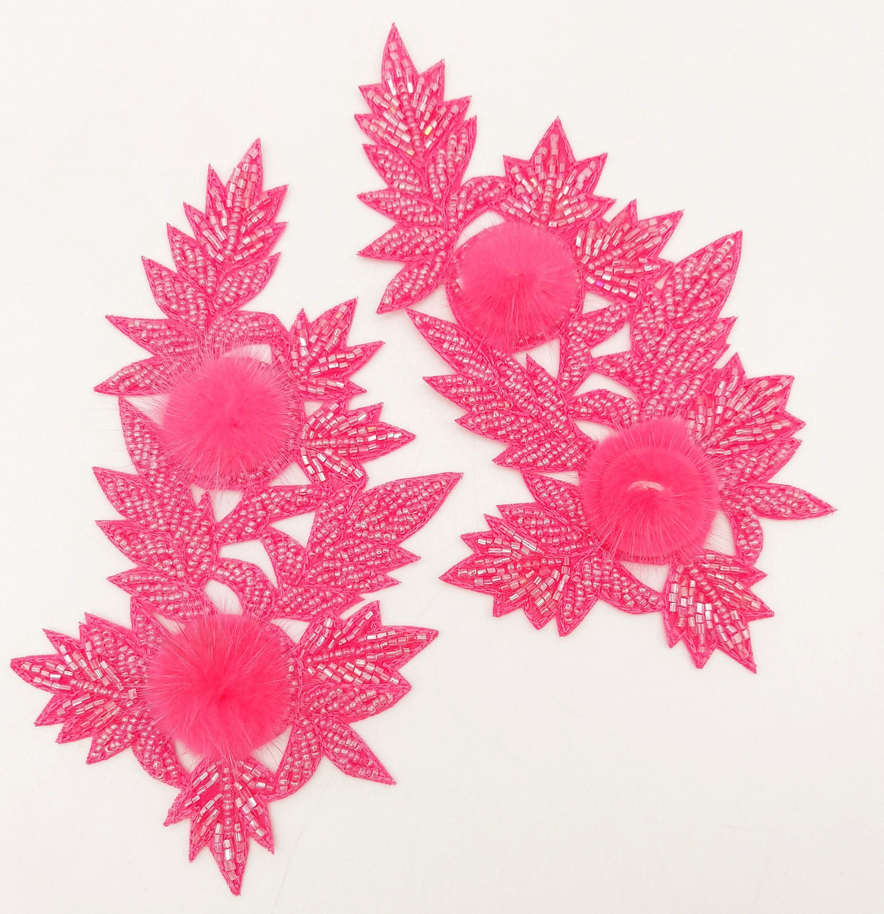 Neon Pink Hand Embroidered Floral Applique, Beaded Floral Motif With Feather Pom Pom, 1 Pc