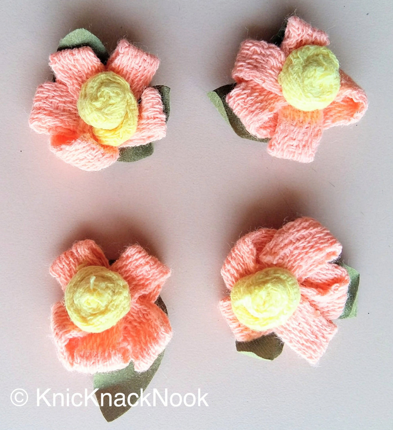 Orange, Yellow And Green Crochet Flower And Leaves Appliqué x 4, Floral Motifs