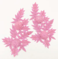 Pink Hand Embroidered Floral Applique, Beaded Floral Motif With Feather Pom Pom, 1 Pc