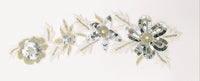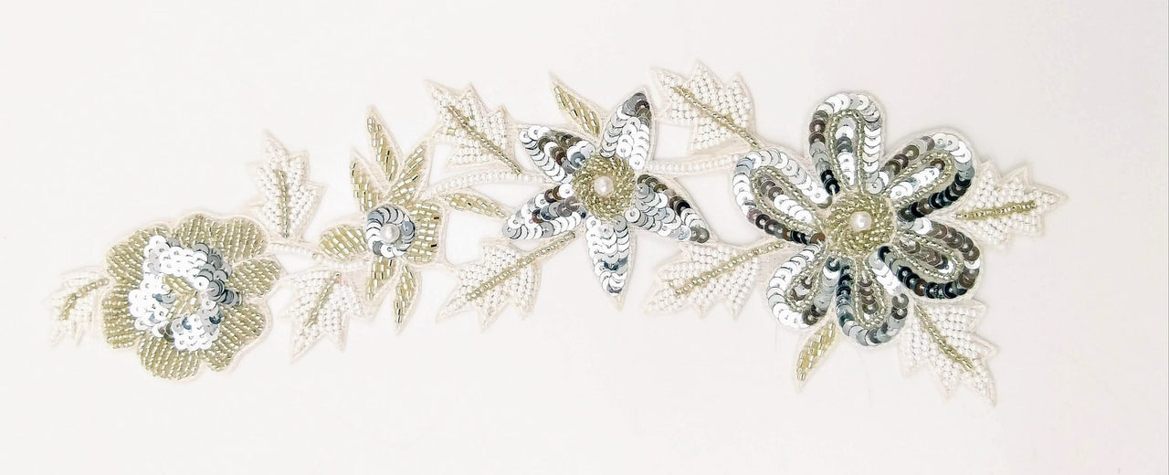 Silver and White Floral Applique Hand Embroidered with Silver Sequins, White Beads and Silver Bugle Beads, Wedding Applique