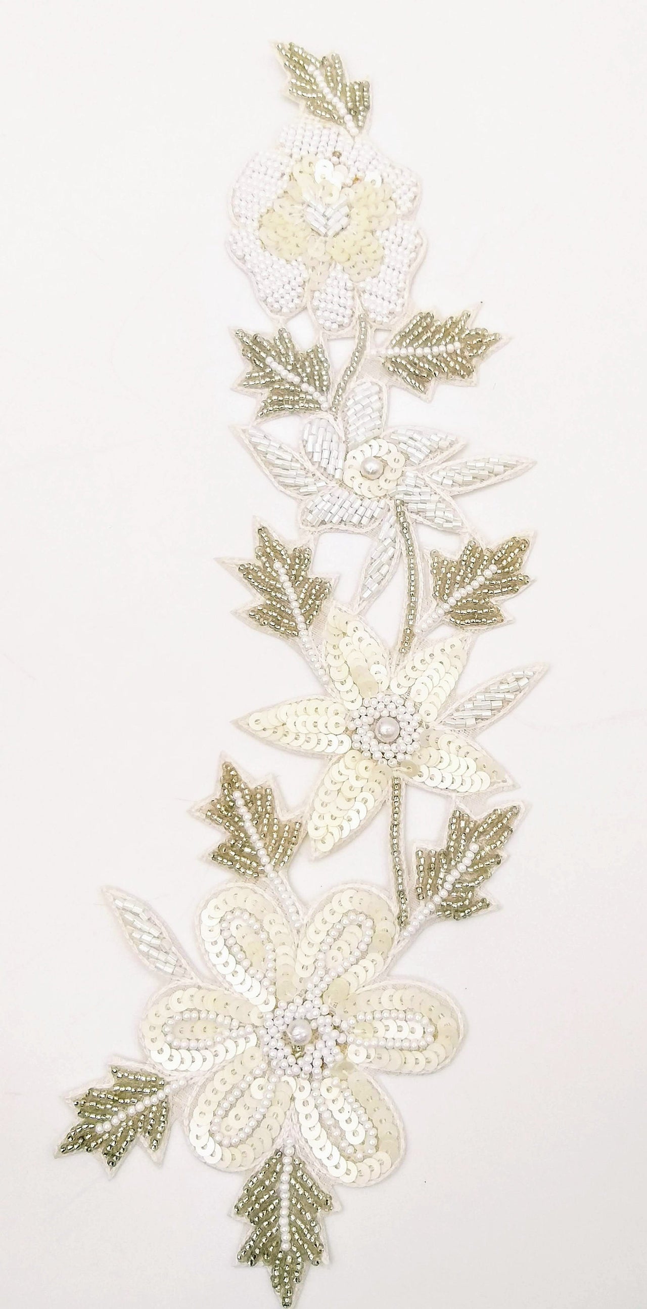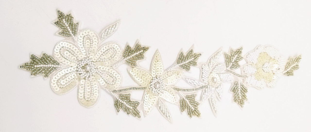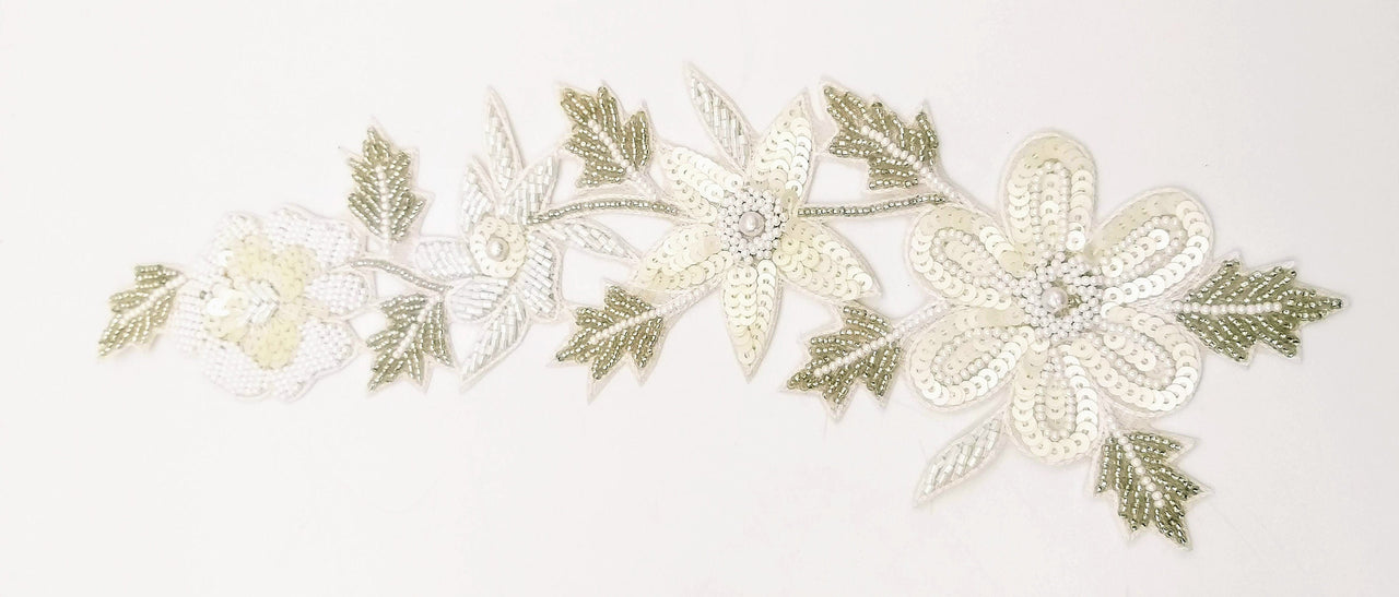White Floral Applique Hand Embroidered with White Sequins, White Beads, Bugle Beads and Silver Beads