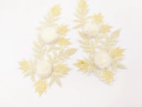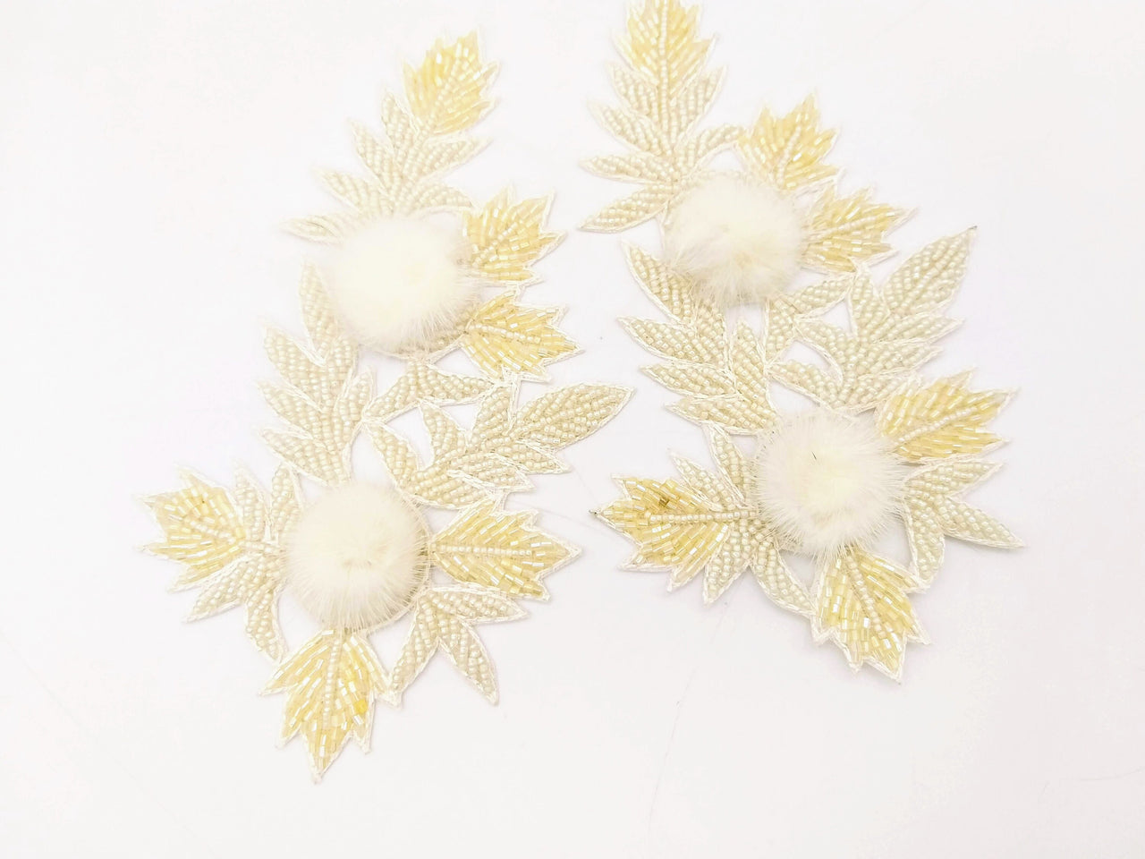 White Hand Embroidered Floral Applique, Beaded Floral Motif With Feather Pom Pom, 1 Pc