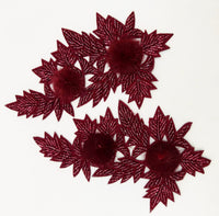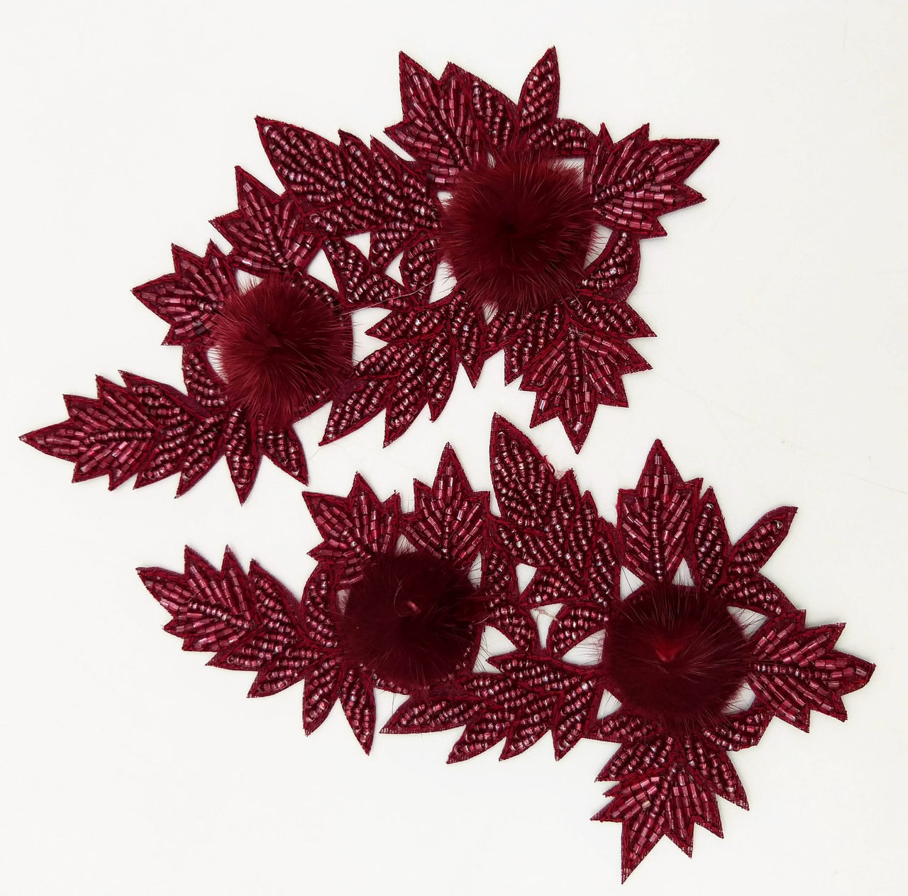 Wine Red Hand Embroidered Floral Applique, Beaded Floral Motif With Feather Pom Pom, 1 Pc