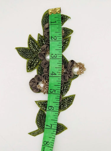 KnicKnackNook proudly presents a lovely Olive Green and Brown Hand Embroidered Floral Applique, Beaded Floral Motif.