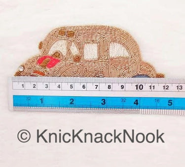KnicKnackNook proudly presents a lovely Hand Embroidered Car Applique In Gold Zardozi And Beige, Red, Brown And Grey Embroidery, Car Motif, Embroidered Applique.