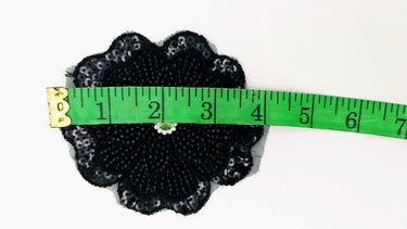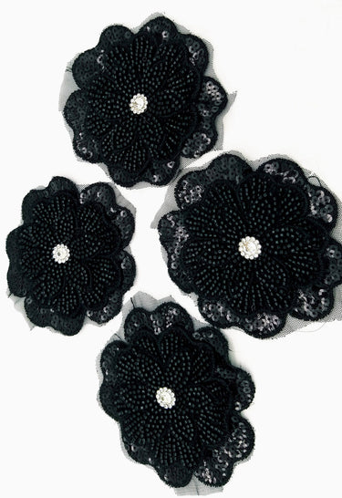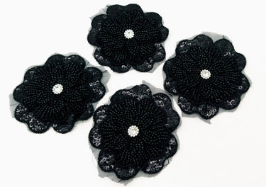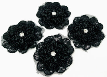 KnicKnackNook proudly presents a lovely Black Hand Embroidered Floral Applique With Beads, Crochet Cut Dana Applique, Beaded Flower Motifs, 1 Piece.