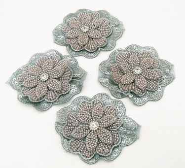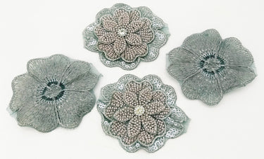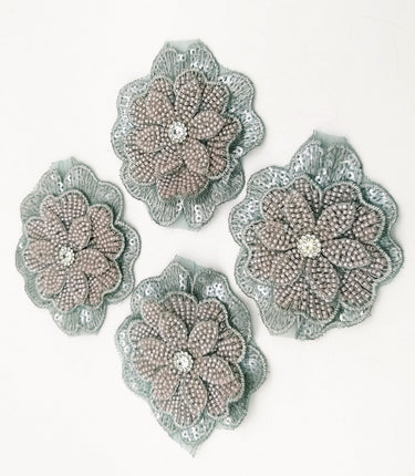 KnicKnackNook proudly presents a lovely Grey Hand Embroidered Floral Applique With Beads, Crochet Cut Dana Applique, Beaded Flower Motifs, 1 Piece.