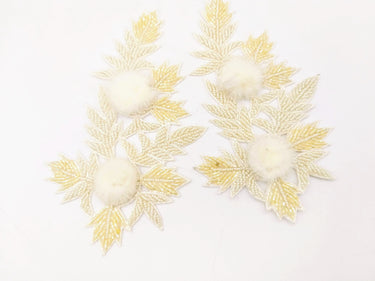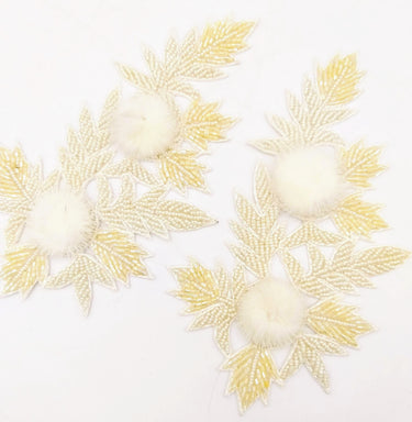 KnicKnackNook proudly presents a lovely White Hand Embroidered Floral Applique, Beaded Floral Motif With Feather Pom Pom, 1 Pc.