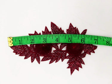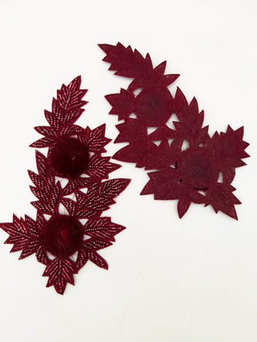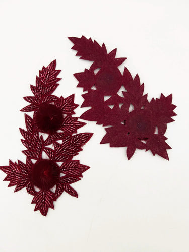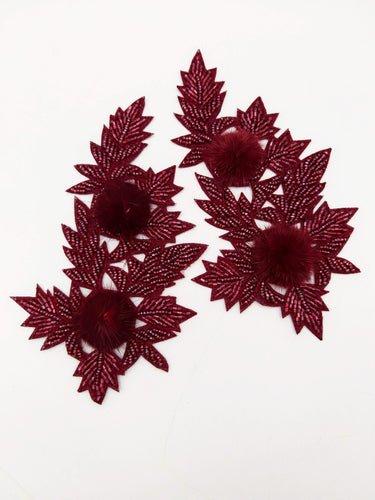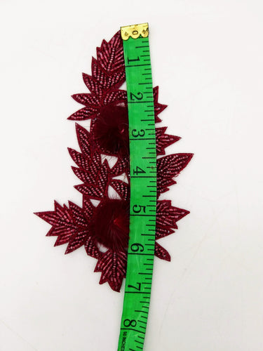 KnicKnackNook proudly presents a lovely Wine Red Hand Embroidered Floral Applique, Beaded Floral Motif With Feather Pom Pom, 1 Pc.
