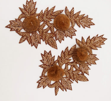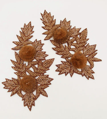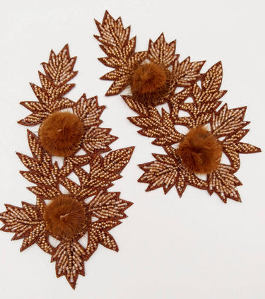 KnicKnackNook proudly presents a lovely Brown Hand Embroidered Floral Applique, Beaded Floral Motif With Feather Pom Pom, 1 Pc.