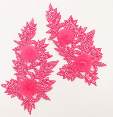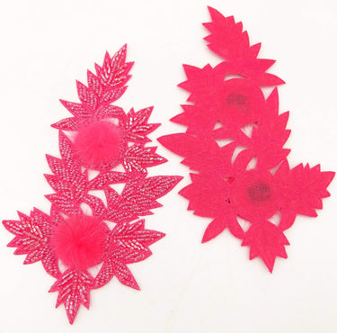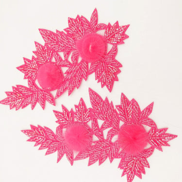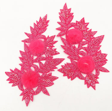 KnicKnackNook proudly presents a lovely Neon Pink Hand Embroidered Floral Applique, Beaded Floral Motif With Feather Pom Pom, 1 Pc.