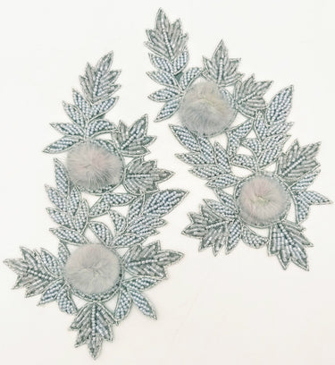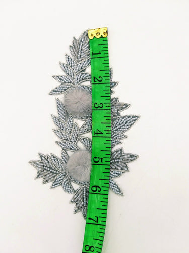 KnicKnackNook proudly presents a lovely Grey Hand Embroidered Floral Applique, Beaded Floral Motif With Feather Pom Pom, 1 Pc.