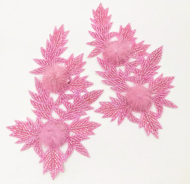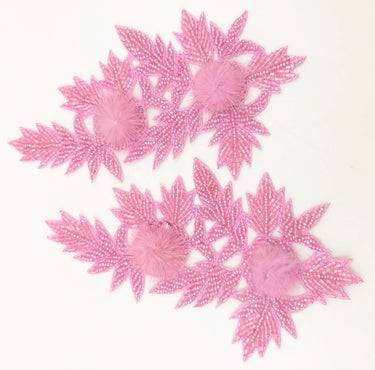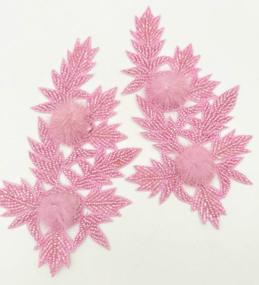KnicKnackNook proudly presents a lovely Pink Hand Embroidered Floral Applique, Beaded Floral Motif With Feather Pom Pom, 1 Pc.