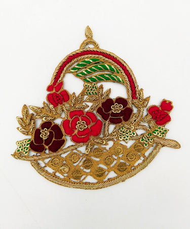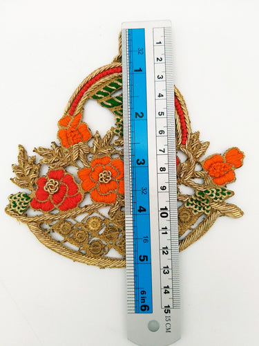 KnicKnackNook proudly presents a lovely Hand Embroidered Zardozi Flower Basket Applique in Orange and Antique Gold with Gold Sequins.