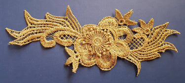 KnicKnackNook proudly presents a Beautiful, stunning, and very unique Antique Gold / Bronze Tone Crochet Thread Fabric Applique With Leaves and Flowers, Flower Applique.