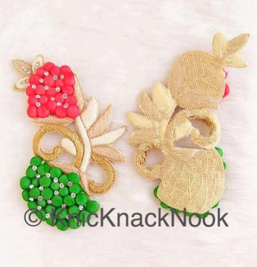 KnicKnackNook proudly presents a Beautiful Red, Green, Beige And Gold Embroidered Flower Applique Patch With Diamante Crytals, 3D Floral Applique.