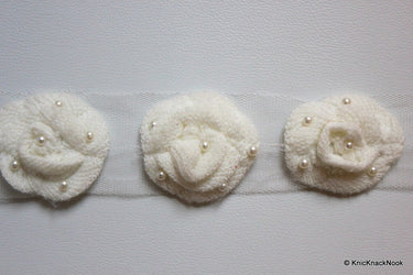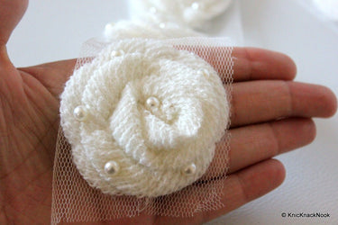 This listing is for Beautiful White Crochet Wool Rose Flower With Pearl Studs Appliqué. The appliqué is carefully stitched on a mesh net which can be directly stitched onto any of your creations.