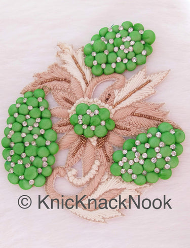 KnicKnackNook proudly presents a Beautiful Green, Beige And Off White Embroidered Flower Applique Patch With Diamante Crytals And Gold Matt Beads, 3D Floral Applique, Floral Motif.