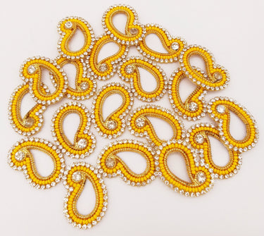 KnicKnackNook proudly presents a lovely 5 Paisley Appliques In Yellow Seed Beads and Rhinestones, Gold Tiny Paisley Appliques, Beaded Applique, Headband Applique Rhinestone Applique. This can be used for quilting, dress design, pillow covers, bag, Headband, Jewellery, the potential is just endless.