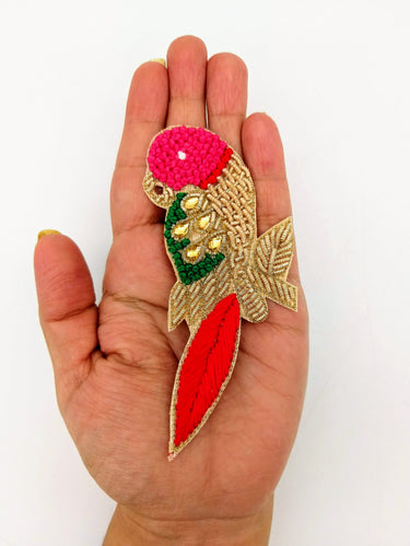 KnicKnackNook proudly presents a lovely Hand Embroidered Bird Applique With Pink and Red Embroidery With Antique Gold Zardozi Work, Parrot Applique, Knot Embroidered Applique. This can be used for quilting, dress design, pillow covers, bag, Headband, Jewellery, the potential is just endless.