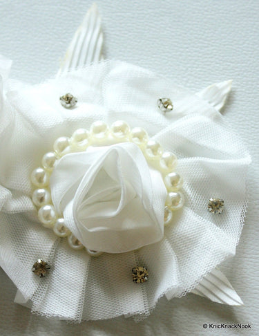 KnicKnackNook proudly presents a Beautiful White Rose Fabric Flower With Pearls and Rhinestones Brooch Applique. This can be used for Dresses, Headbands, Wedding outfits, Wedding Accessories, Corsages, Brooches, Prom Dresses the potential is just endless.