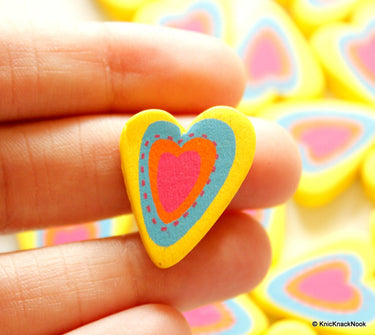 This listing is for Yellow, Blue, Orange And Pink Heart Wood Beads x 5. These are lovely beads and will brighten up any jewellery or craft creations.