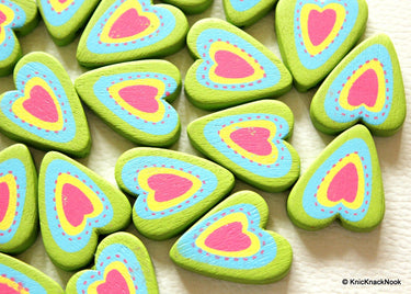 This listing is for Green, Blue, Yellow And Pink Heart Wood Beads x 5. These are lovely beads and will brighten up any jewellery or craft creations.