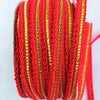 The embroidery on this trim is called Zardozi, an exclusive type of embroidery that is done by hand. Zardozi comes from two Persian words: zar or zarin meaning 'gold', and dozi meaning 'sewing'. Zardozi is a type of heavy and elaborate metal embroidery on a silk, satin, or velvet fabric base.