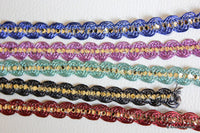 The embroidery on this trim is called Zardozi, an exclusive type of embroidery that is done by hand. Zardozi comes from two Persian words: zar or zarin meaning 'gold', and dozi meaning 'sewing'. Zardozi is a type of heavy and elaborate metal embroidery on a silk, satin, or velvet fabric base.