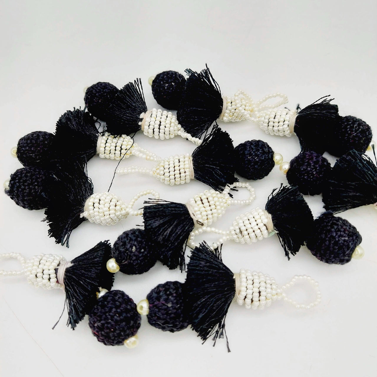 This listing is for a lovely Black Crochet Ball Tassels With White Pearls Beads, Tassel Charms, Nylon Tassels x 2