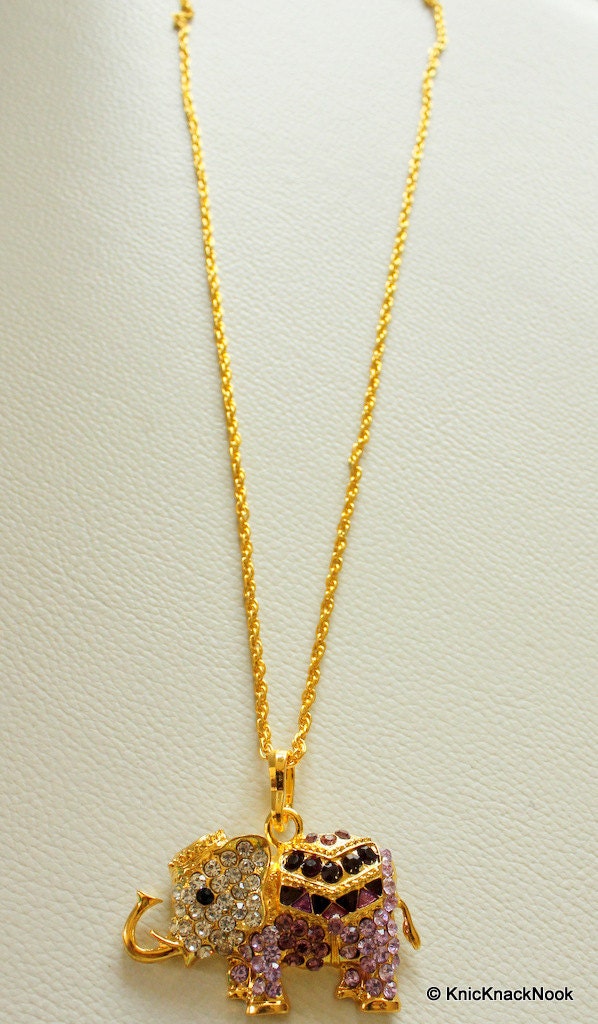 Gold Tone Black, Purple And Clear Rhinestones Pendant, Elephant Pendant
