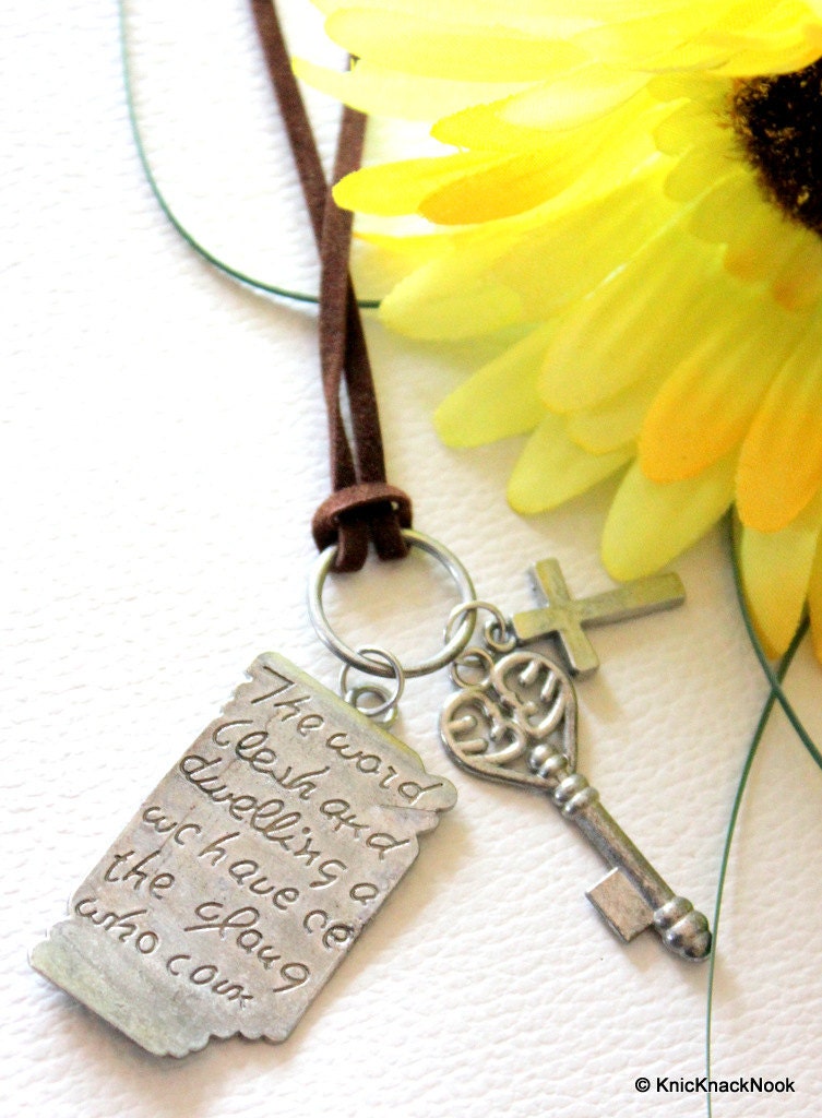 Shakespeare Message With Key And Cross Silver Pendant with Brown Necklace