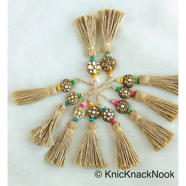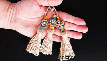 This listing is for a lovely Twine Brown Tassels With Kundan Stone, Embellished Wooden Button, Tassel Charms, Jute Tassels.