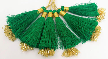 This listing is for a lovely Crusoe, Dark Green Tassels With Gold Cap And Beads, Tassel Charms, Nylon Tassels.