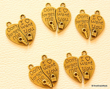 This listing is for 6 x Two pieces of a Heart 'Don't forget me', 'I want you' Bronze Tone Charms for jewelry making, scrap booking, making mobile phone charms or sewing onto garments.