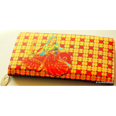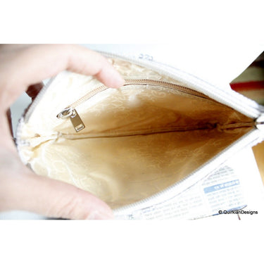 The whole clutch is lined with Beige fabric. This is a Zipped clutch purse and has a side handle.