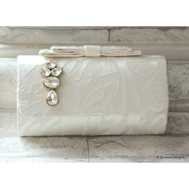 This White clutch features a bow on the top and is accented by a beautiful crystal embellishment. The inside is a beige fabric, and the purse includes a stiff layer that gives it shape yet flexibility. It closes with a magnetic snap. This purse can be used as a hand held clutch or can be used as a sling purse. The chain is on the inside of the purse so can be used with or without it.