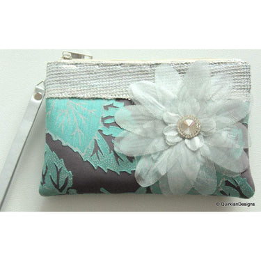This Green, Grey And Silver Fabric clutch features sequins on the top part of the purse and is accented by a beautiful silver flower embellishment. The inside is a beige fabric. It closes with a zip. This purse can be used as a hand held clutch.