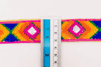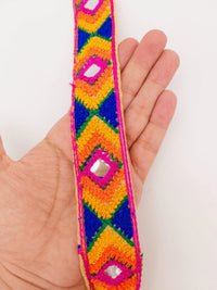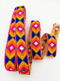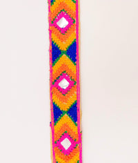 Beige Cotton Fabric Embroidered Mirrored Trim In Fuchsia Pink, Orange, Yellow