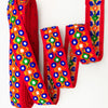 The embroidery on this trim is called Zardozi, an exclusive type of embroidery that is done by hand. Zardozi comes from two Persian words: zar or zarin meaning 'gold', and dozi meaning 'sewing'. Zardozi is a type of heavy and elaborate metal embroidery on a silk, satin, or velvet fabric base.