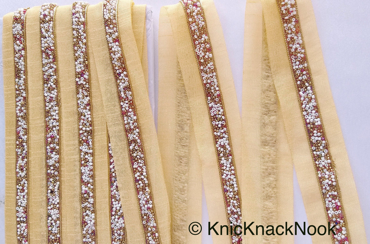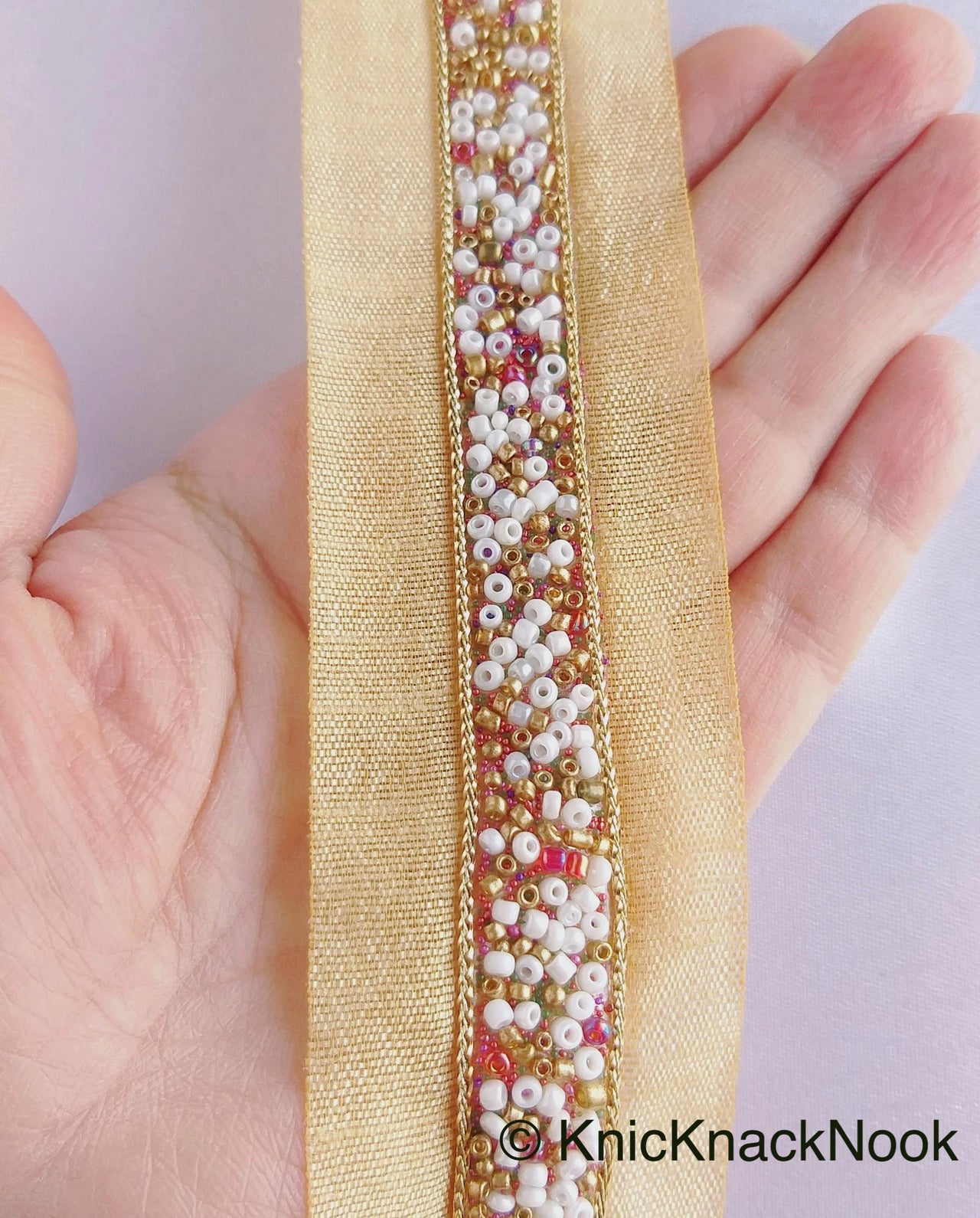 Beige Fabric Trim With Copper, Gold And White Beads Embellishments, Beaded Trim