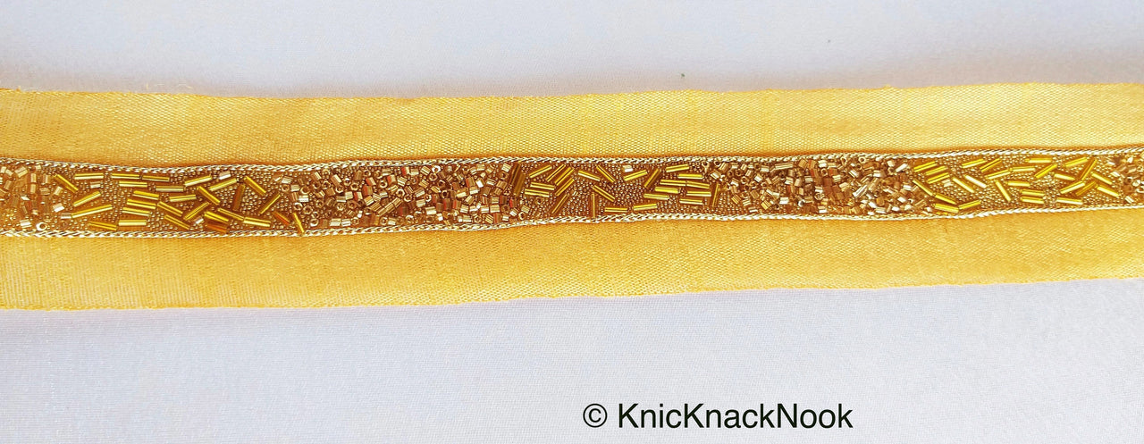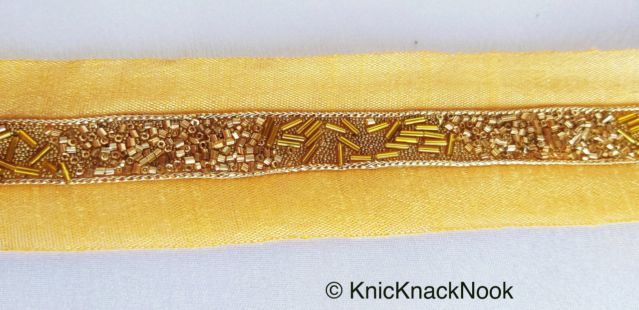 Beige Fabric Trim With Gold Bugle Beads Embellishments, Beaded Trim, Approx. 38mm