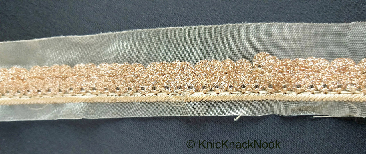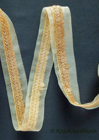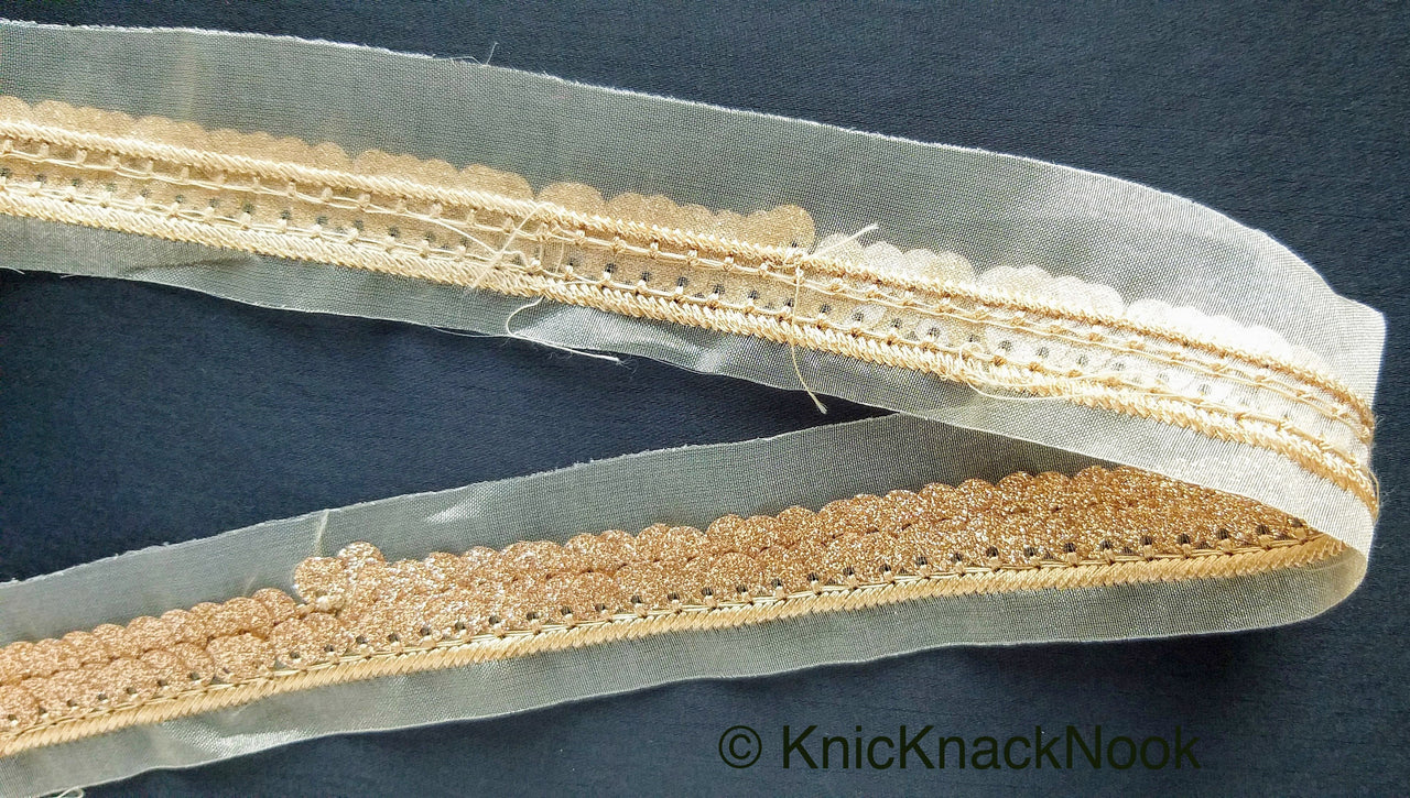 Beige Sheer Fabric Trim Embroidered With Beige Silk Thread And Glitter Copper Sequins, Approx. 33mm Wide